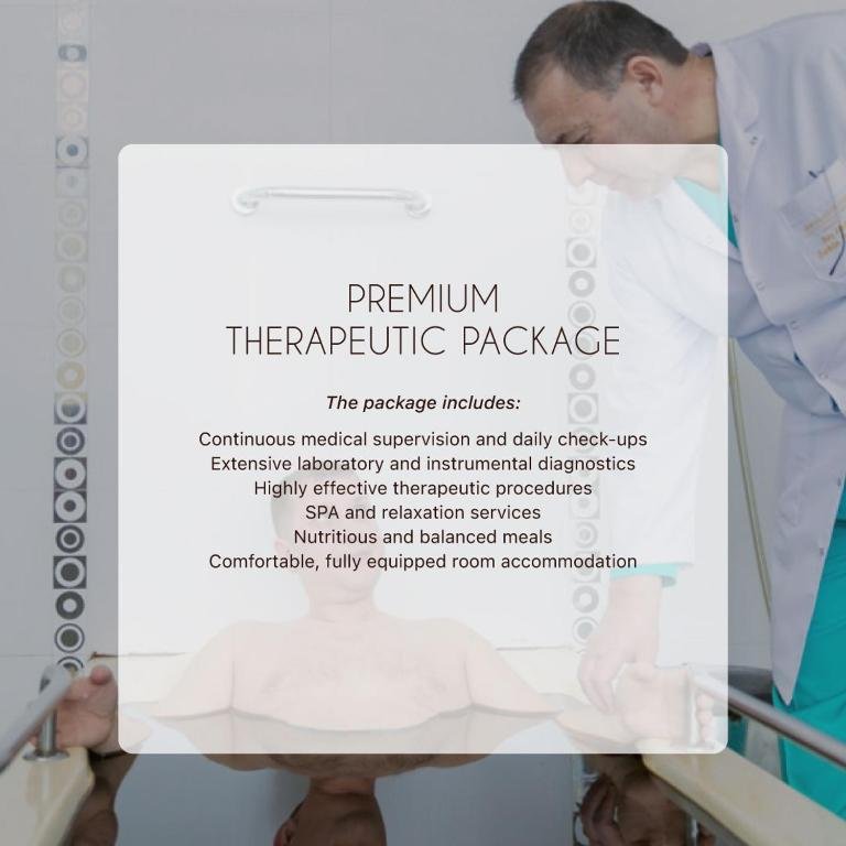 После заселения каждый гость проходит первичную консультацию врача, диагностику и лабораторные анализы. На основании результатов врач составляет индивидуальную лечебную программу, включающую ванны, физиотерапию, лечебную физкультуру и дополнительные процедуры.