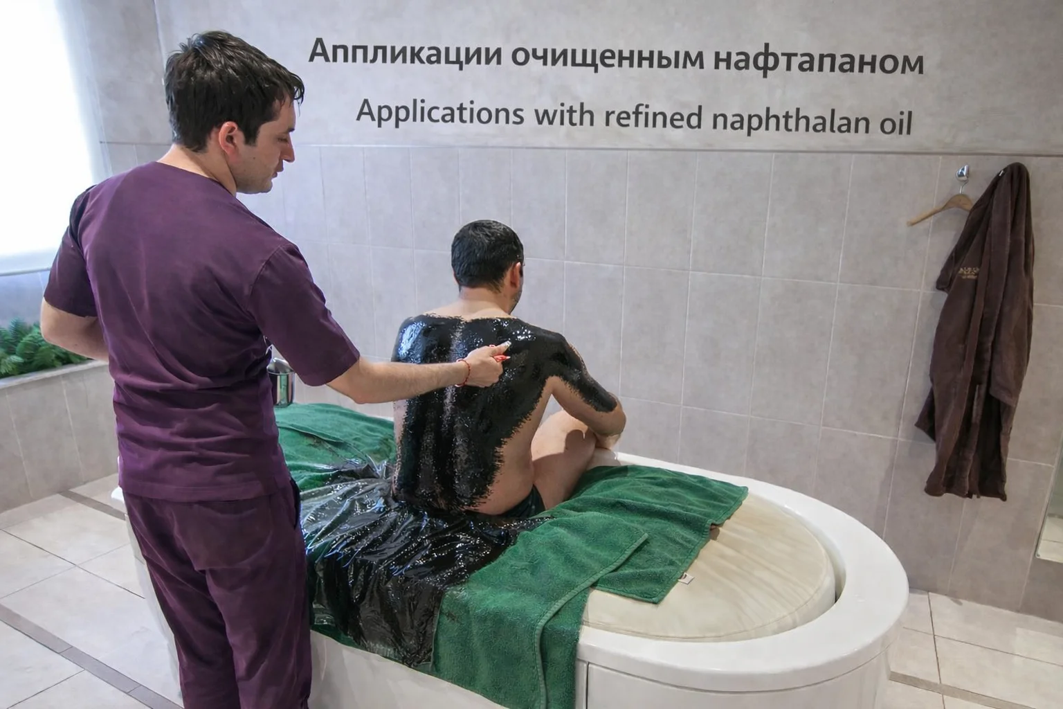 Во время процедуры пациент погружается в ванну с нагретой нафталановой нефтью температурой 37–38°C.